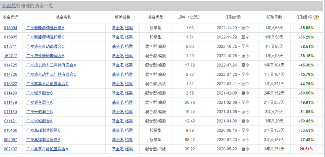 目前,郑澄然在管的14只基金中仅广发鑫享灵活配置混合A创造了34.10%的收益外,其他产品任职回报亏损幅度大部分超过30%,其中,广发成长动力三年持有混合成立以来亏损了超40%,广发兴诚混合C亏损幅度高达48.23%。