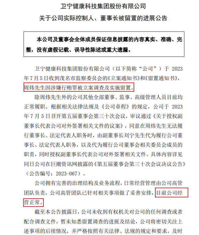 同日,卫宁健康公布了周炜被留置的最新进展,表示于当日收到茂名市监察委员会的《立案通知书》和《留置通知书》,周炜因涉嫌行贿罪被立案调查及实施留置。