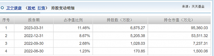 具体来看,2022年二季度,朱红裕管理的招商核心竞争混合A首次买入卫宁健康,2022年三季度、四季度以及2023年一季度,又分别买入1000万股、4000万股、1670万股,截至一季度末,该基金总持仓高达6875.27万股,占总股本比例3.2%。