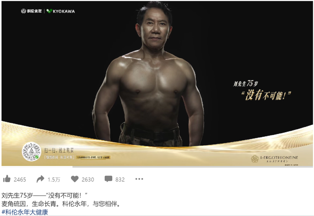 刘革新亲自赤膊上阵带货,代言麦角硫因产品。其实也是为了提振川宁生物的业绩,让更多目标客群了解到新产品。