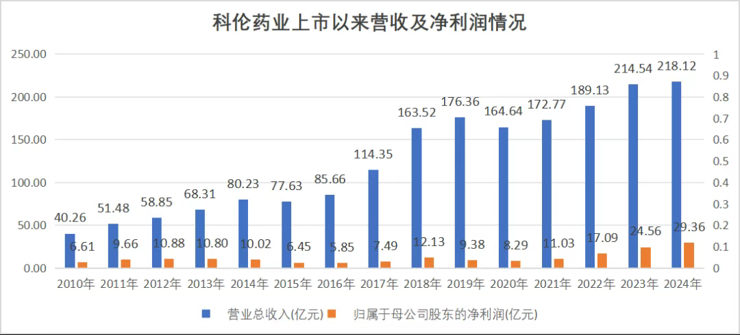 2024年,科伦药业实现营业收入218.12亿元,同比增长1.67%;净利润29.36亿元,同比增长19.53%,双双创下历史新高。