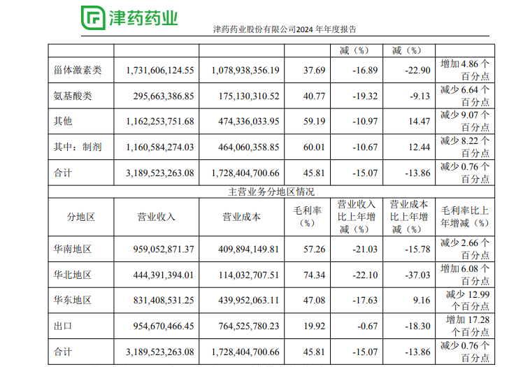 2024年,津药药业在华南和华东地区的毛利率均同比减少,主要原因是子公司重点产品受产品结构及产品集采的影响,使得收入和毛利率同比减少。