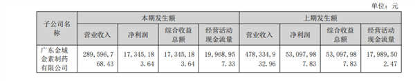 据了解,金城金素主要从事头孢菌素类粉针制剂的研发、生产和销售,主要生产销售的产品注射用头孢唑林钠、注射用头孢噻肟钠等。收购完成后,金城金素在业绩承诺期(2019-2021年)超额完成业绩对赌。但金城金素经营状况从2024年起持续承压。2024年其营收从上年的9.66亿元降至8.16亿元,净利润从1.17亿元缩减至6745.68万元;2025年上半年进一步下滑,实现营收为2.9亿元,净利润为1734.52万元,去年同期的营收、净利润分别为4.78亿元、5309.8万元。