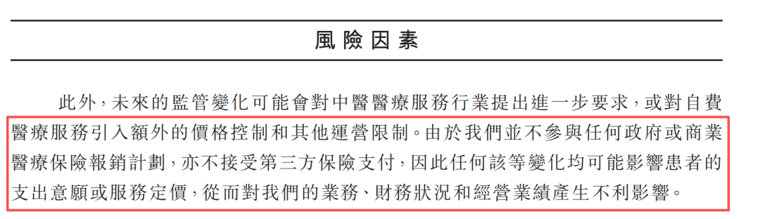图源:誉研堂招股书据誉研堂招股书显示,在风险因素一栏中,赫然写着:“我们并不参与任何政府或商业医疗保险报销计划,亦不接受第三方保险支付”,也就是说,来誉研堂看病的患者,必须全部自费。