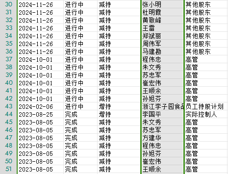 11月26日,李子园还发布了一则股东集体减持的公告。公告显示,公司股东朱卫君、徐樟能等35名股东因个人资金需求,拟通过集中竞价交易方式减持公司股份,减持总数不超过301.86万股,即不超过公司股份总数的0.77%。