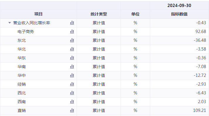 前三季度,李子园在华东、华中、华北、华南、东北、西北等六个区域的营收均出现了不同程度的下滑。其中,营收占比过半的核心区域华东市场下滑0.36%。