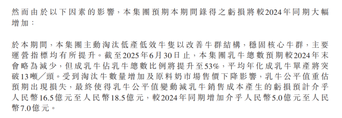 而在今年上半年,国内原奶价格仍处于低位运行,加之现代牧业淘汰牛数量的增加,最终使得乳牛公平值变动减乳牛销售成本产生的亏损预计在16.5亿元至18.5亿元,较2024年同期增长5亿元至7亿元的亏损。