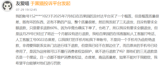 在黑猫投诉平台,证券之星注意到,除了少部分投诉内容指向门店服务质量外,更多的投诉内容集中在产品品控、食品安全方面,这些投诉不仅暴露了百果园在品控环节的漏洞,也让其“高品质”的品牌定位受到质疑。事实上,此次余惠勇所引发的争议表述,根源也在于他对“水果太贵”这一质疑的回应。
