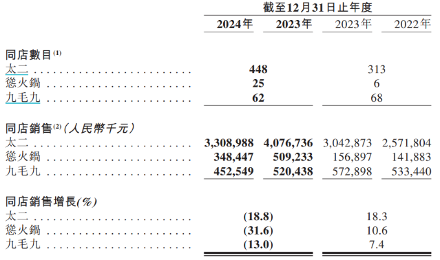证券之星注意到,太二的多项经营指标在2024年就表现出承压迹象。该年,九毛九整体营收同比小幅增长1.5%至60.74亿元,来自太二的收入却同比下滑1.4%至44.13亿元,其中该品牌直营门店的翻台率由上年同期的4.1次/天减少至3.5次/天,同店销售额也大幅下滑18.8%。对于前述指标承压的原因,九毛九将其归因于该年度的外部环境变化及餐饮市场的激烈竞争。