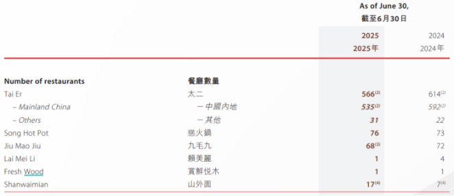 今年上半年,太二经营指标仍不理想,直营店的翻台率由上年同期的3.8次/天下降至3.1次/天,同店销售额同比下降19%。与此同时,太二扩张节奏自2024年起显著放缓,2023年、2024年,太二门店规模分别净增长128间、56间,今年上半年的门店数量则净减少65间,九毛九解释称,太二上半年收入承压与其报告期内门店规模大幅缩减以及同店销售不振有关。
