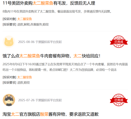 今年9月,太二还卷入“活鱼现杀”争议,有网友质疑太二酸菜鱼为预制菜,而在黑猫投诉平台中,部分投诉内容显示,消费者通过外卖平台下单太二菜品后,发现餐品中含有异物。