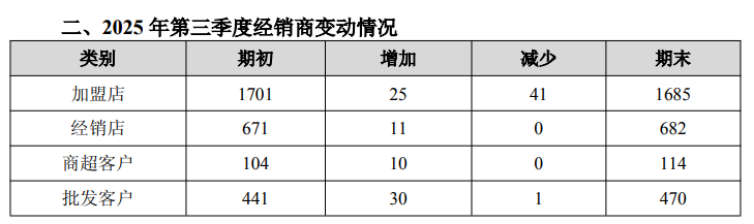 不过从第三季度表现看,零售渠道的承压状态并未得到改善,期内加盟店经销商数量净减少16家,来自加盟店的收入同比下滑3.47%至9419.98万元,期末加盟店数量进一步收缩至1685家。相比之下,第三季度经销店的经销商数量回暖,期内净增加11家,收入表现却呈现疲态,来自经销店的收入同比大幅下滑53.27%至1108.57万元。