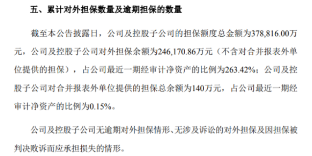 业绩之外,皇氏集团的资金压力同样值得关注。2025年前三季度,公司经营活动产生的现金流量净额为-2623.01万元,同比大幅下滑121.85%,货币资金由年初的4.21亿元降至2.29亿元。而同期短期借款超10亿元、一年内到期非流动负债为2.35亿元,现金与短期债务比率仅约0.19。此外,截至2026年3月27日,公司及控股子公司的对外担保总额已达37.89亿元,超过最近一期经审计净资产的100%,偿债能力面临考验。
