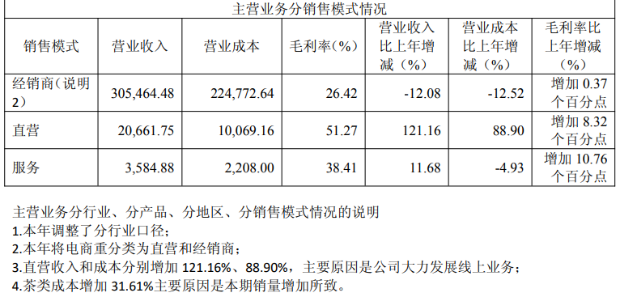然而,渠道转型中的“新旧动能转换”仍远未实现。年报显示,公司收入结构依然高度依赖传统经销模式:报告期内,经销商渠道贡献收入30.55亿元,占营业总收入的91%左右;而直营渠道占比仅约6%。更值得关注的是,经销商渠道收入同比下降12.08%,呈现明显萎缩;尽管直营渠道增速可观,但其规模尚小,短期内远不足以弥补经销商渠道下滑带来的巨大缺口。