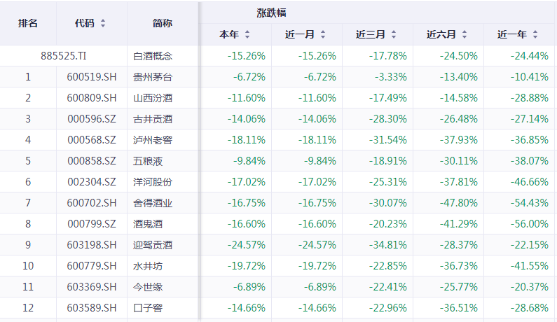同花顺数据显示,在白酒概念板块48家上市公司中,十余只核心龙头股表现“全军覆没”。过去一年,舍得酒业、酒鬼酒跌幅均超过50%;即便是“最抗打”的贵州茅台,跌幅也超过10%。