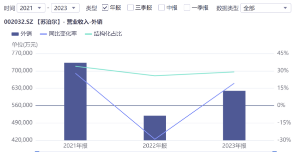 从外销收入来看,2021年至2023年,公司的外销业务分别为73.26亿元、51.91亿元、61.96亿元,变动幅度分别为27.91%、-29.09%、19.28%,存在明显的波动。