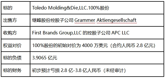 9月22日,继峰股份公告,控股子公司Grammer Aktiengesellschaft(以下简称:格拉默)拟以4000万美元的初始交易价格出售ToledoMolding&DieLLC.(以下简称:TMD)100%股权。据继峰股份初步核算,本次出售TMD股权将对公司2024年业绩造成重大影响,预计亏损2.8亿元至3.8亿元。