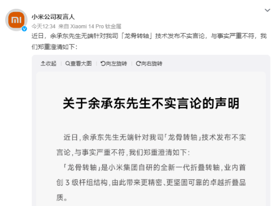 近日,车圈因为懂车帝评测遭多方质疑的事而备受市场关注,手机圈这边也没闲着。12月12日午间,小米公司发言人官方微博发文称,华为余承东近日针对小米“龙骨转轴”技术发布了不实言论,公司认为相关言论与事实严重不符,进而作出郑重澄清。