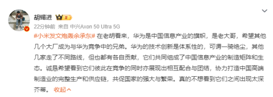 小米表示,希望余承东先生能够遵循“科学与严谨”的基本规则,停止抹黑同行,误导公众。