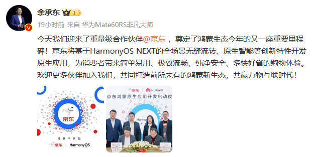 日前,华为常务董事余承东发布微博称,华为迎来重量级合作伙伴@京东,奠定了鸿蒙生态的又一座重要里程碑。