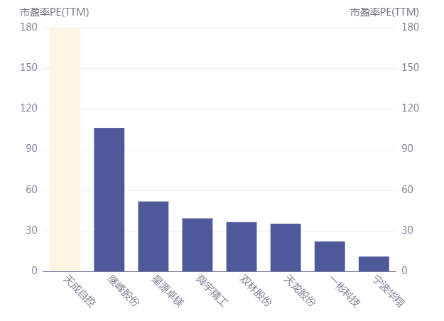 最新交易日数据显示,天成自控股价虽然在中低位徘徊,但市盈率高达近180倍,遥遥领先同行。