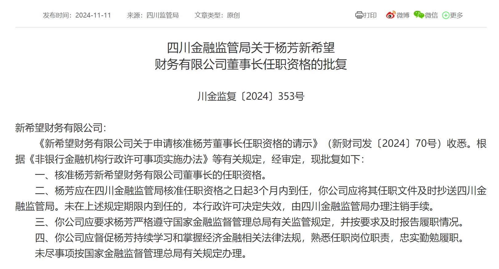 《新希望财务有限公司关于申请核准杨芳董事长任职资格的请示》(新财司发〔2024〕70号)收悉。根据《非银行金融机构行政许可事项实施办法》等有关规定,经审定,现批复如下: