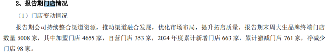然而在2024年,当金价高企抑制消费时,依赖“走量铺货”的加盟渠道边际效益减弱,品牌不得不关闭低效门店。截至2024年末,周大生门店数量总计5008家,其中在2024年,公司大幅收缩门店规模,对加盟店和自营门店的撤减数量分别为:717家和44家,全年净减少门店98家,而上年同期公司净增门店490家。