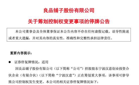 7月10日晚间,良品铺子发布公告称,公司控股股东宁波汉意创业投资合伙企业(有限合伙)(以下简称“宁波汉意”)正在筹划重大事项,该事项可能导致公司控制权变更。公司股票将自7月11日(周五)开市起停牌,预计停牌时间不超过两个交易日。