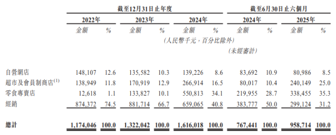 支撑起公司业绩增长的重要抓手,在于渠道端拓展,尤其是商超会员店与零食量贩两大新兴渠道的发力。报告期内,公司来自商超会员店的收入由2022年的1.39亿元,增长至2024年的2.67亿元,今年上半年的收入已达到2.4亿元。公司解释称,该渠道的增长主要系推出定制产品、推出产业化包装及产品供应以及与知名商超会员店建立的合作关系。