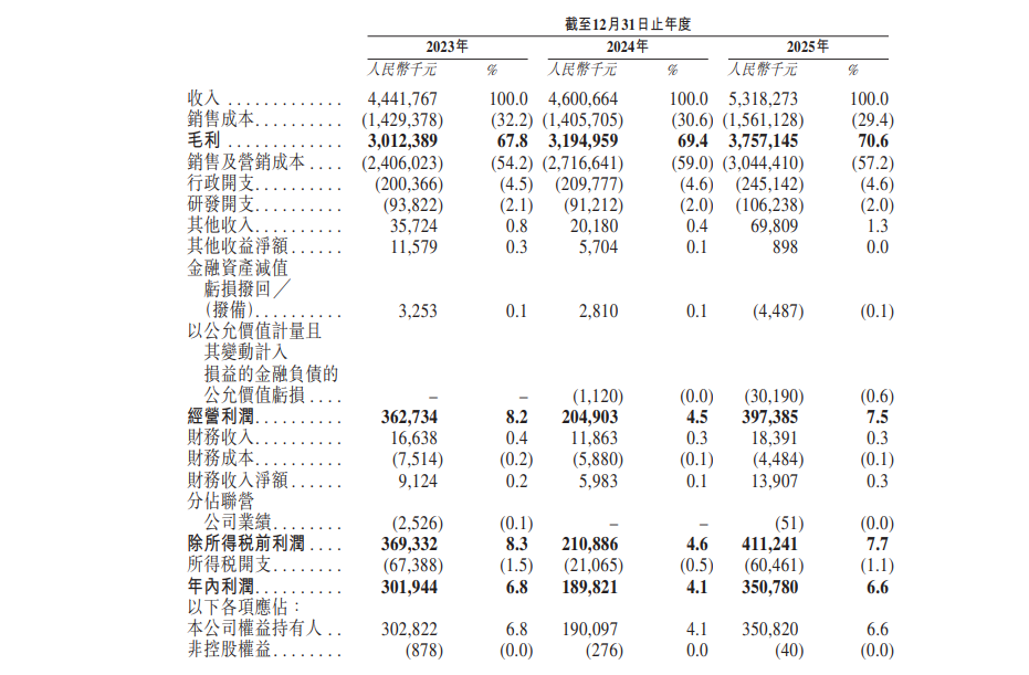 以2025年为例,公司每赚取100元收入,毛利润为70.65元,但其中57.25元被销售及营销成本抵消,占比超过八成。在2024年营销投入占比逼近60%的历史峰值时,净利润同比暴跌了37.22%。