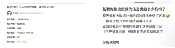 证券之星注意到,公司信息泄露的问题至今未能根治。今年11月14日,在黑猫投诉平台上,有用户以“个人信息泄漏、骚扰电话不断”为由投诉智联招聘。在社交平台上,也有不少用户反馈智联招聘存在信息泄露的情况。