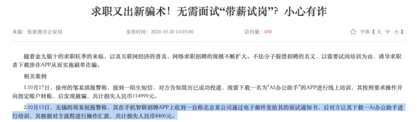 除了信息泄漏,在智联招聘平台上还存在一些求职骗局。根据张家港公安局的通报,一名用户在智联招聘APP上收到面试通知书,面试方以试岗培训为由,要求其下载涉诈APP,进而诱导进行诈骗,导致该用户共计损失8400元。