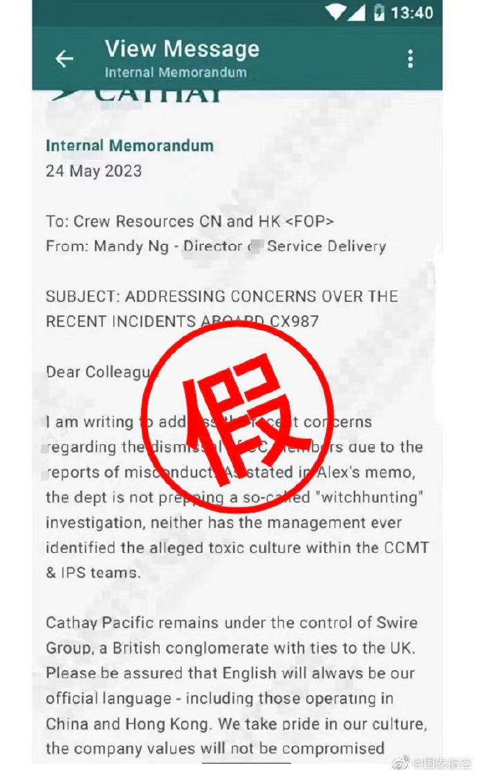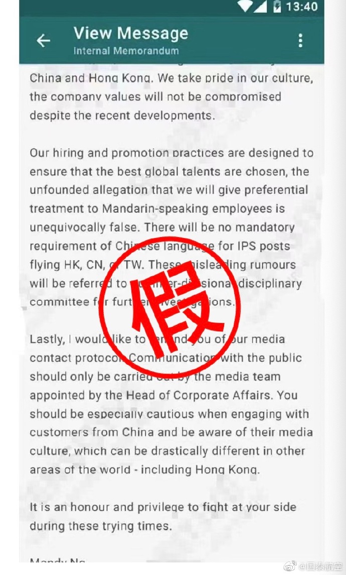 国泰航空:网传有关航空服务董事发出的英文内部信件系伪造