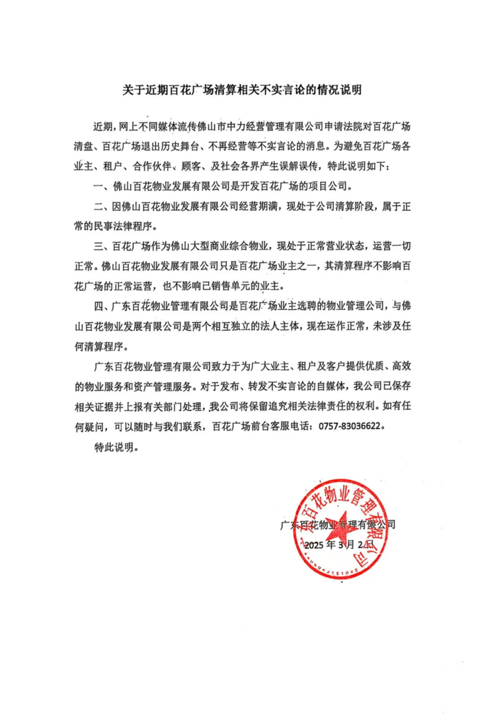 3月4日,广东百花物业管理有限公司通过官微发布声明称,公司是百花广场业主选聘的物业管理公司,与佛山百花物业发展有限公司是两个相互独立的法人主体,现在运作正常,未涉及任何清算程序。