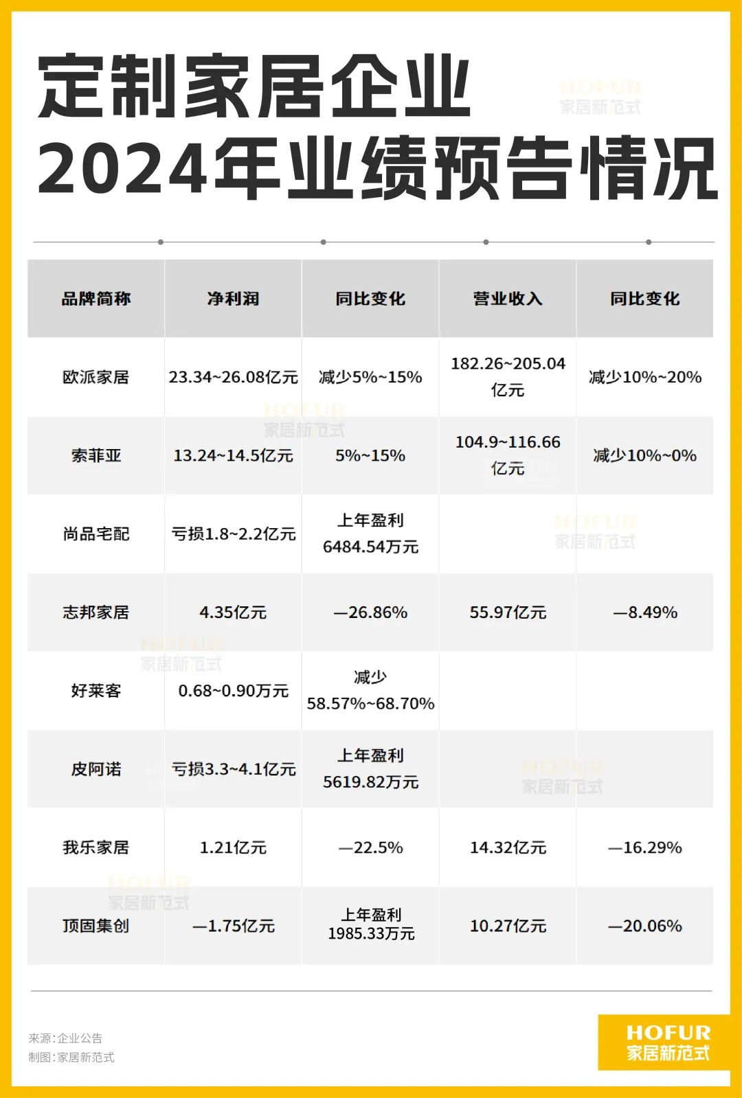 事实上,家居新范式关注到,欧派、索菲亚、尚品宅配、志邦家居、好莱客和皮阿诺此前都发布过2024年业绩预告,除了索菲亚净利润是正增长外,其余5家公布的净利润预告均呈现全面的下滑。已公布营收预估的,增幅皆为同比下降,凸显大家居行业整体承压较重。