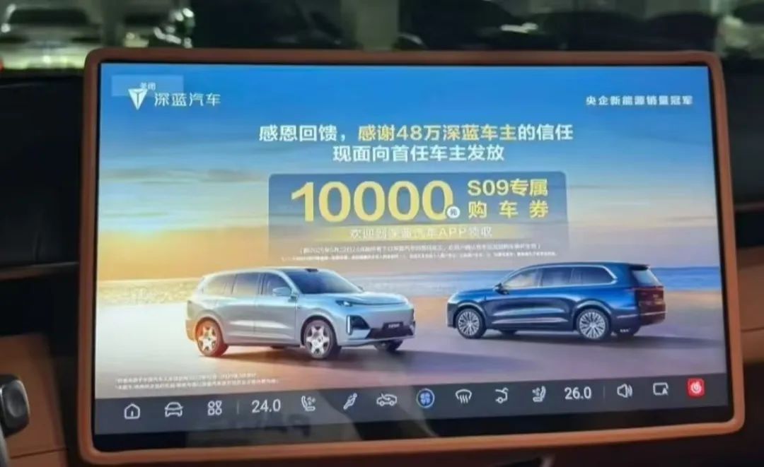 根据网友提供的开机广告照片显示,车机屏幕上打着“感恩回馈,面向首任车主发放专属购车券”宣传语。有车主称,看到该广告后一脸懵,且越看越生气,有部分车主联系“深蓝管家”投诉。