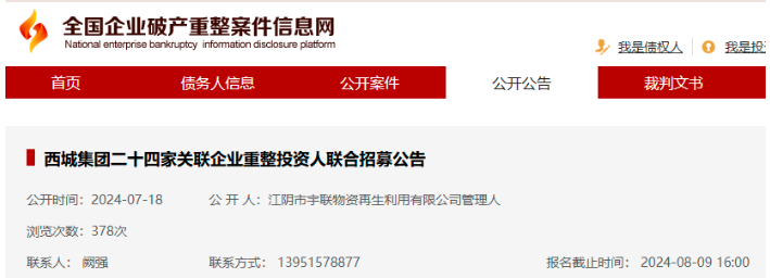 图 3 西城钢铁重整公告(来源:重整案件信息网)