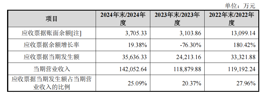 以银行汇票或者商业汇票支付货款符合汽车产业惯例。回复文件显示,华新精科应收票据金额不断增加,报告期末,应收票据余额分别为1.3亿元、3102万元和3705万元,其中,2024年应收票据发生额高达3.5亿元,发生额占到了当期营业收入的25%。
