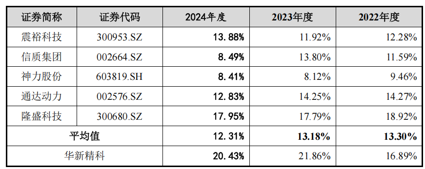 华新精科选取的可比公司包括震裕科技、信质集团、神力股份、通达动力等,可比公司均包括电机铁芯制造。《招股书》显示,华新精科可比公司在2022年到2024年的平均毛利率在13%左右。相比较而言,报告期内,华新精科的平均毛利率超过20%。2022年到2024年,华新精科毛利率分别为18%、22%和22%,显著高于可比公司。