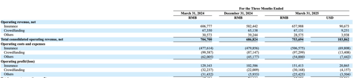 目前,水滴分三个业务板块披露营业收入:以水滴保为代表的保险相关业务、以水滴筹为代表的大病求助业务和以翼帆医药为代表的医药创新业务。据2025年第一季度业绩报告显示,水滴在该季度实现营业收入为7.54亿元,同比增长7%;归母净利润为1.08亿元,同比增长34.2%。