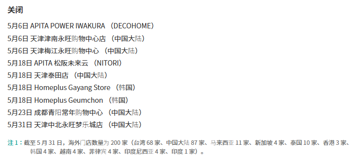 截至2025年5月末,宜得利在海外门店共有200家,其中中国大陆87家,中国台湾68家,东南亚及其他地区的门店数量合计45家。由此计算,不到半年的时间,宜得利中国门店净减少19家。