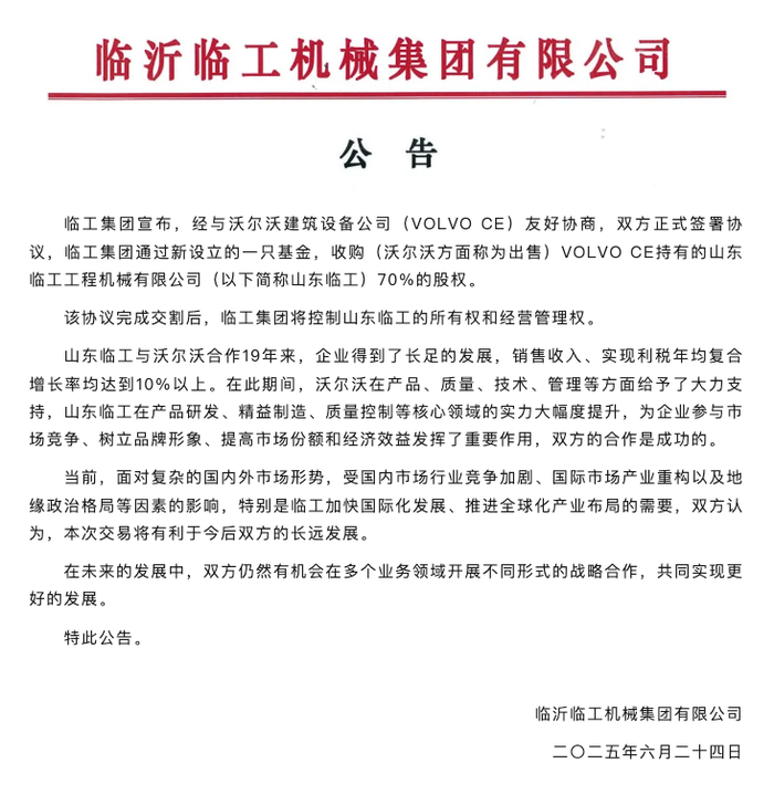 6月24日,临沂临工机械集团有限公司(下称临工集团)宣布,经与沃尔沃建筑设备公司(VOLVO CE)友好协商,双方正式签署协议,临工集团通过新设立的一只基金,收购(沃尔沃方面称为出售)VOLVO CE持有的山东临工工程机械有限公司(以下简称山东临工)70%的股权。该协议完成交割后,临工集团将控制山东临工的所有权和经营管理权。