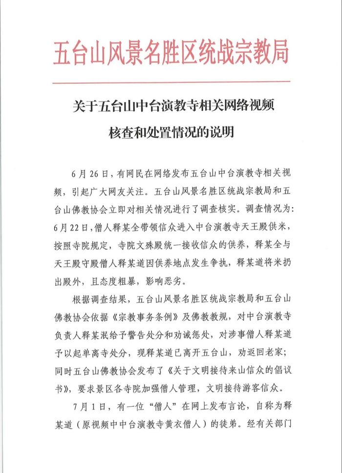 7月2日,山西五台山管委会发布关于五台山中台演教寺相关网络视频核查和处置情况的说明。