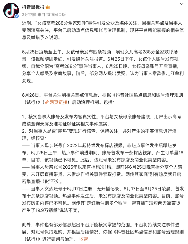 7月2日,抖音黑板报官方微博发布公告称,近期,“女孩高考288分全家欢呼”事件引发公众及媒体关注。因相关热点及当事人受到较高关注,平台已启动热点信息和账号治理机制。现将平台所能掌握的相关信息及举措予以说明。