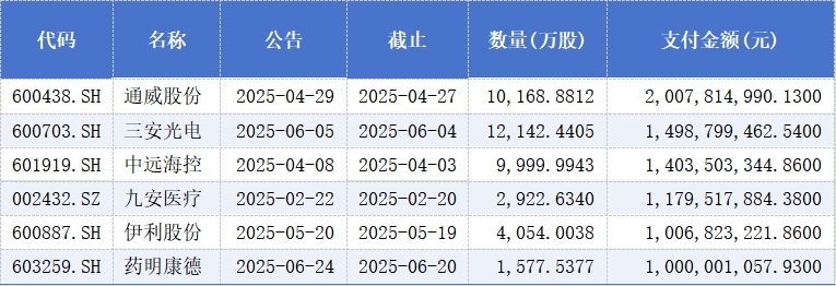 从累计回购金额来看,超过10亿元的上市公司有6家,分别为通威股份、三安光电、中远海控、九安医疗、伊利股份、药明康德,金额分别为20.08亿元、14.99亿元、14.04亿元、11.80亿元、10.07亿元、10亿元。
