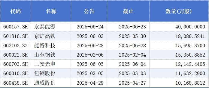 从累计回购股份数量来看,截至上半年,回购完成且累计回购股份数量已超1万股的上市公司有7家,分别为永泰能源、京沪高铁、能特科技、山东钢铁、三安光电、包钢股份、通威股份,分别累计回购4万股、1.80万股、1.57万股、1.54万股、1.21万股、1.16万股、1.02万股。