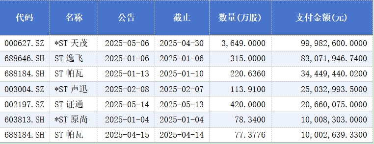 具体来看,*ST天茂累计回购3649万股,共计9998.26万元,ST逸飞累计回购315万股,共计8307.20万元,ST帕瓦累计回购220.64万股,共计3445万元,*ST声迅累计回购113.91万股,共计2503.30万元,ST证通累计回购420万股,共计2066万元,*ST原尚累计回购78.34万股,共计1000.83万元,ST帕瓦累计回购77.38万股,共计1000.26万元。
