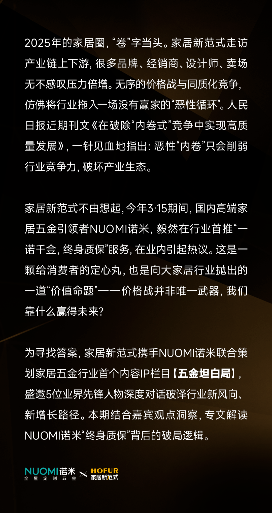 家居新范式认为,NUOMI诺米“终身质保”的推出,其深远意义在于对“品质至上”和“长期主义”价值观的践行。我们期待,这一“诺”能激发行业共振,进一步带动上游材料升级、中游工艺精进、下游服务优化,共同构建一个基于“价值共创”的健康生态。这或许正是中国家居业摆脱恶性内卷、迈向高质量发展的必经之路。