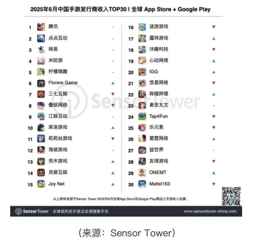 消息面上,近日,Sensor Tower商店情报平台显示,2025年6月共33个中国厂商入围全球手游发行商收入榜TOP100,合计吸金17.6亿美元,占同期全球TOP100手游发行商收入33%。