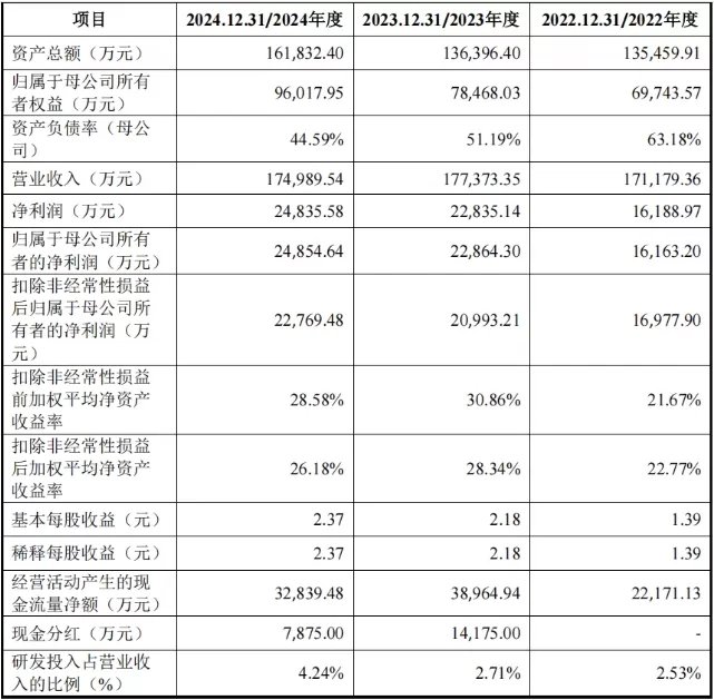 2022年-2024年,公司营业收入分别为171,179.36万元、177,373.35万元和174,989.54万元,归母净利润分别为16,163.20万元、22,864.30万元和24,854.64万元,营业收入增长几乎停滞。